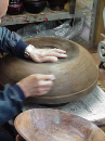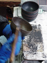 下地が固まった後に研いでいる写真です。 面を比較的平らにする事と次の漆塗りの密着を 良くするためです。 |