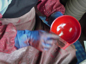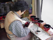 色々塗った椀を並べてある様子です。 次の日には乾いています。 |