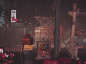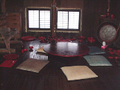 二階のショールームです。 床は全面,漆が塗ってあります。 この部屋の柱、壁は100年経っており、 特に壁は、昔は一階にいろりがあったので、 すすけて、黒っぽい感じが私は気に入っています。 |