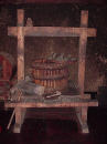 柿渋を作る道具を正面から撮りました。 私が中学3年の時まで、この道具で柿渋を作っていました。柿をもちをつくようにツブシ、写真中央の 竹の籠の中に入れ、上からジャッキで圧力をかけて 押します。すると下からジワジワと渋が出てきます。それを桶にいれます。すぐ使えません、発酵するのです。約1年後に使用します。 |